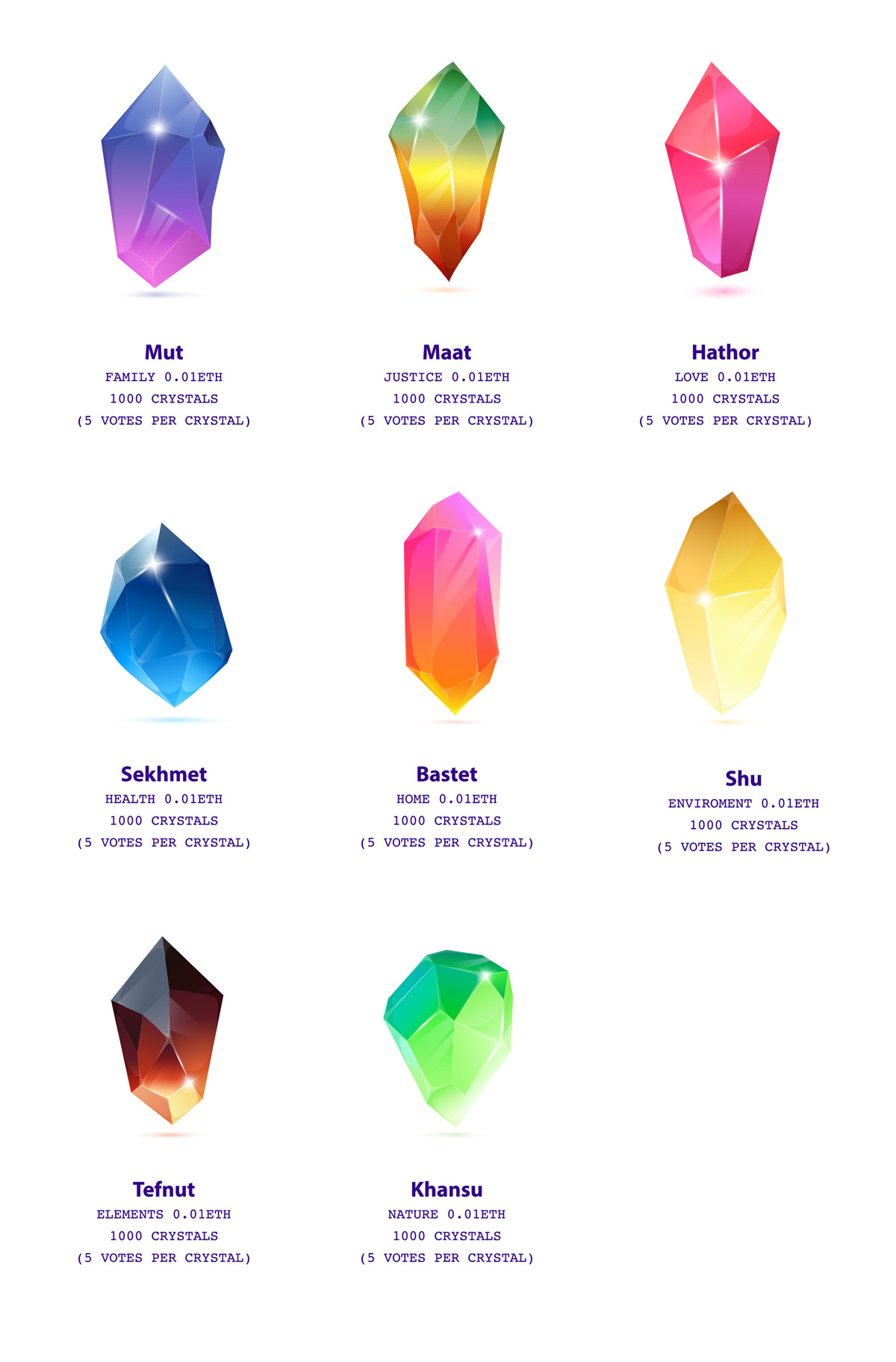 Crystals are named after 8 additional Egyptian Gods, representing the following values: